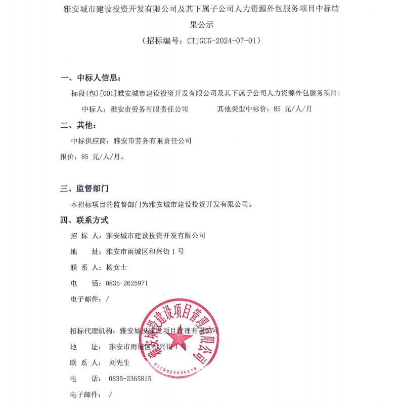 雅安城市建設(shè)投資開發(fā)有限公司及其下屬子公司人力資源外包服務(wù)項目中標結(jié)果公示