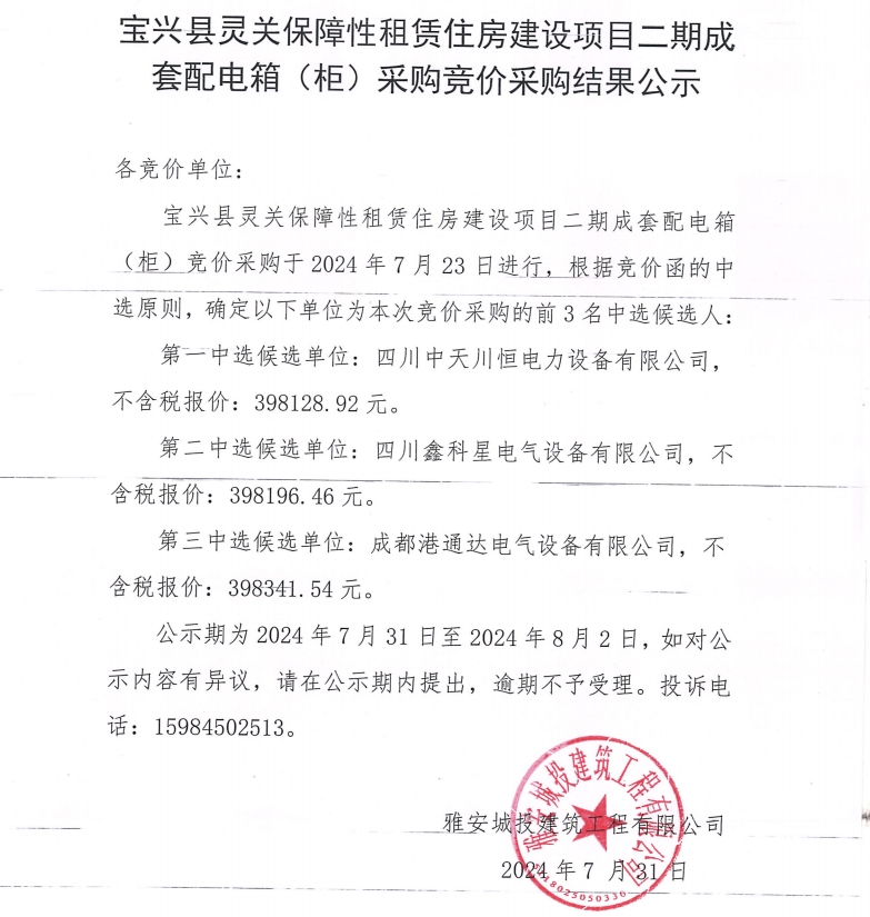 寶興縣靈關(guān)保障性租賃住房建設(shè)項(xiàng)目二期成套配電箱(柜)采購(gòu)競(jìng)價(jià)采購(gòu)結(jié)果過公示