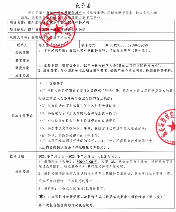 附件1:競(jìng)價(jià)函--雅州壹號(hào)院直飲水管材及配件材料采購