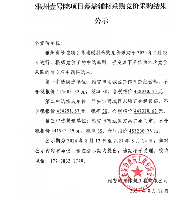 雅州壹號(hào)院項(xiàng)目幕墻輔材采購(gòu)競(jìng)價(jià)采購(gòu)結(jié)果公示
