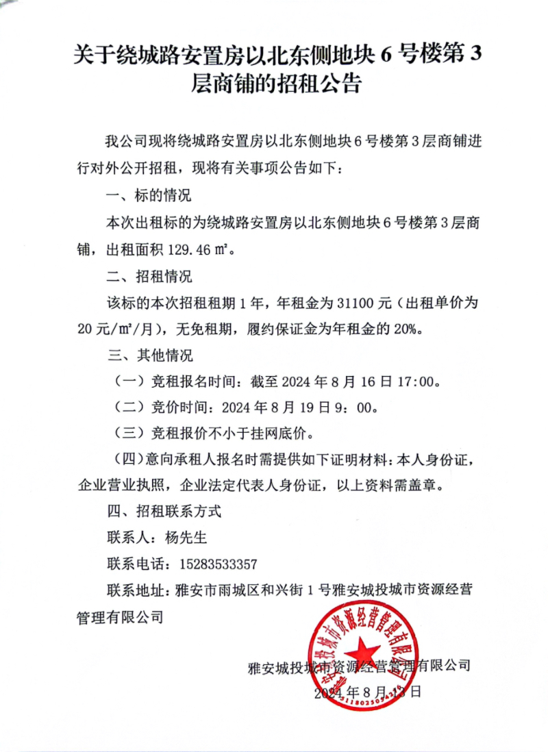 關(guān)于繞城路安置房以北東側(cè)地塊6號樓第3層商鋪的招租公告