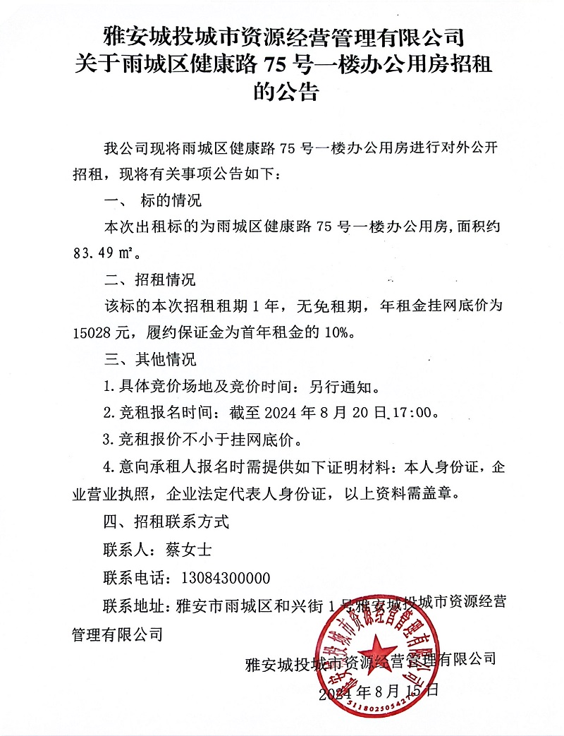 雅安城投城市資源經(jīng)營管理有限公司關(guān)于雨城區(qū)健康路75號(hào)一樓辦公用房招租的公告