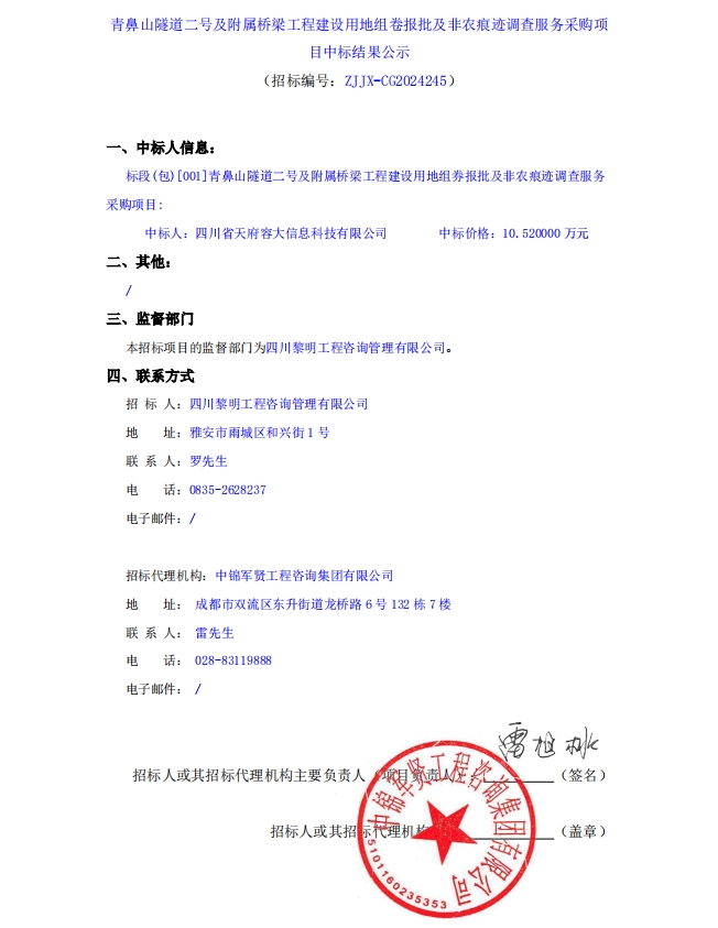 青鼻山隧道二號(hào)及附屬橋梁工程建設(shè)用地組卷報(bào)批及非農(nóng)痕跡調(diào)查服務(wù)采購(gòu)項(xiàng)目中標(biāo)結(jié)果公示