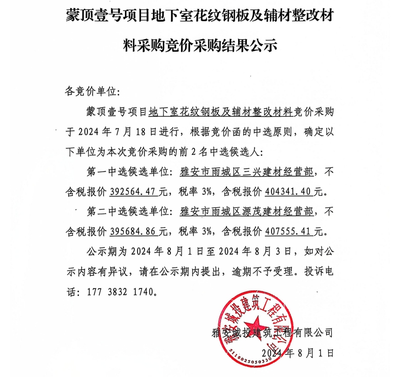 蒙頂壹號(hào)項(xiàng)目地下室花紋鋼板及輔材整改材料采購(gòu)競(jìng)價(jià)采購(gòu)結(jié)果公示