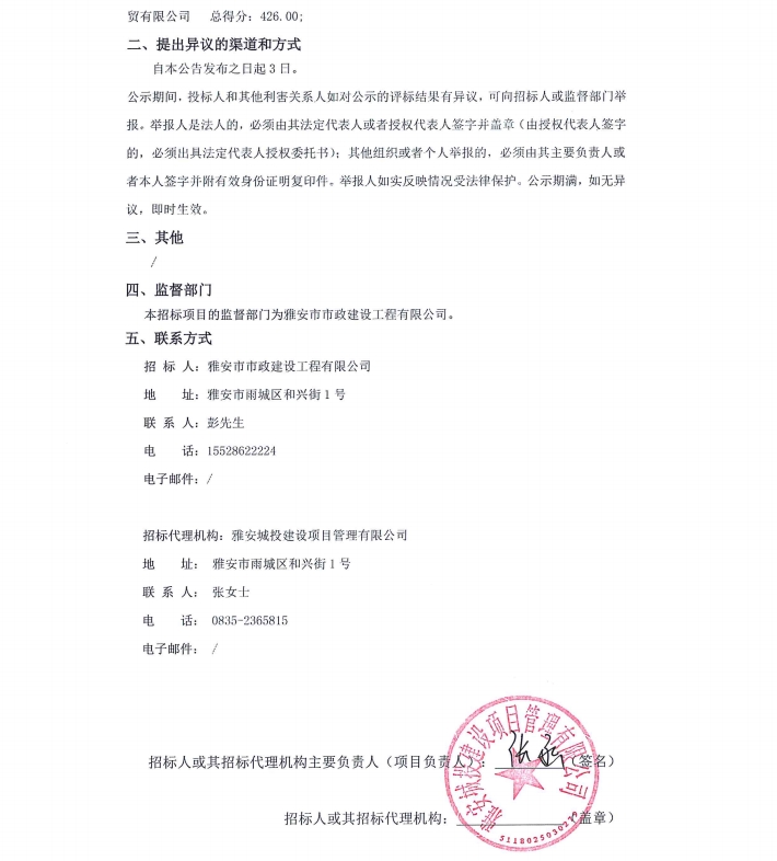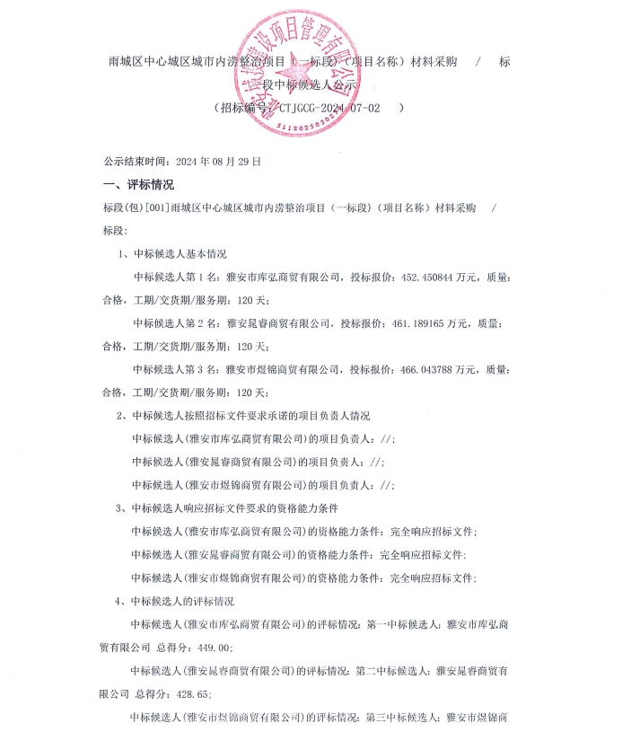 雨城區(qū)中心城區(qū)城市內(nèi)澇整治項目(一標(biāo)段)(項目名稱)材料采購/標(biāo)段中標(biāo)候選人公示