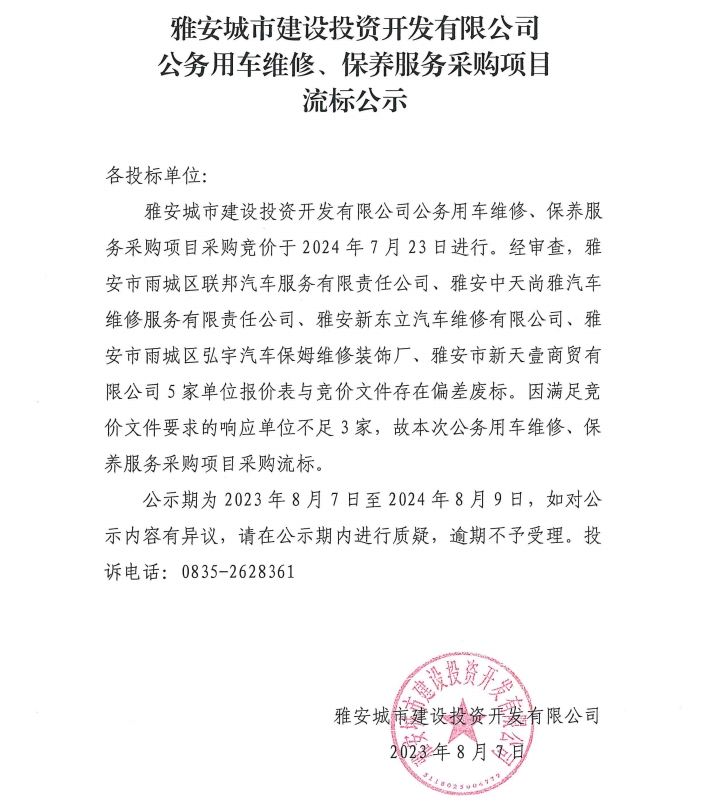 雅安城市建設(shè)投資開發(fā)有限公司公務(wù)用車維修、保養(yǎng)服務(wù)采購項(xiàng)目流標(biāo)公示