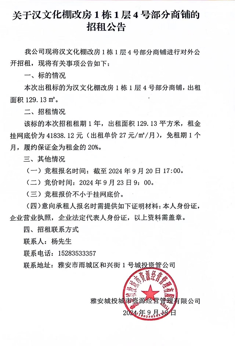 關(guān)于漢文化棚改房1棟1層4號部分商鋪的招租公告