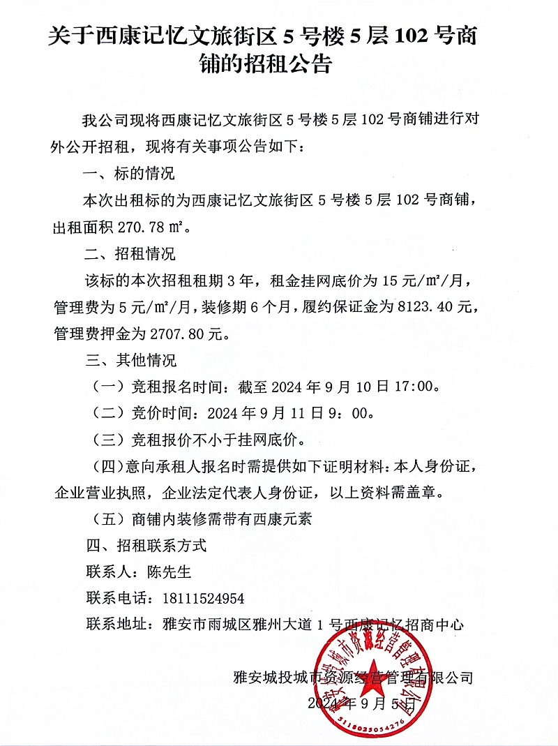 關于西康記憶文旅街區(qū)5號樓5層102號商鋪的招租公告