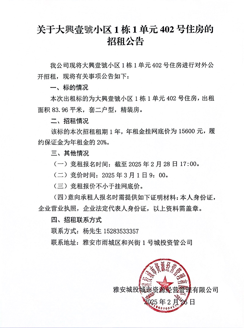 關于大興壹號小區(qū)1棟1單元402號住房的招租公告