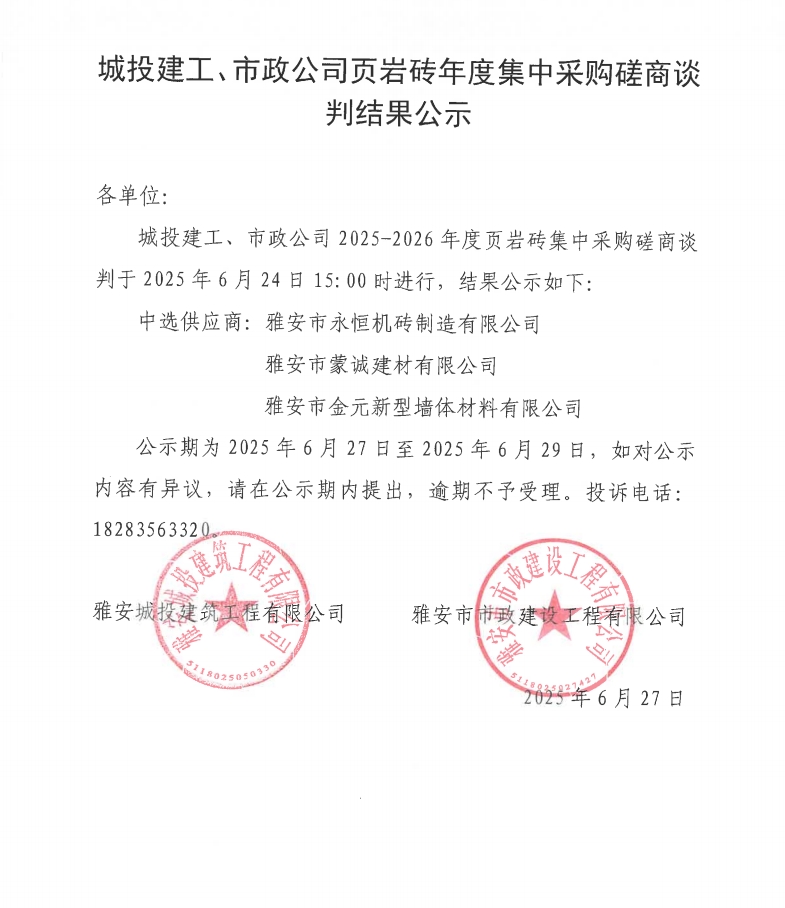 城投建工、市政公司頁巖磚年度集中采購磋商談判結果公示