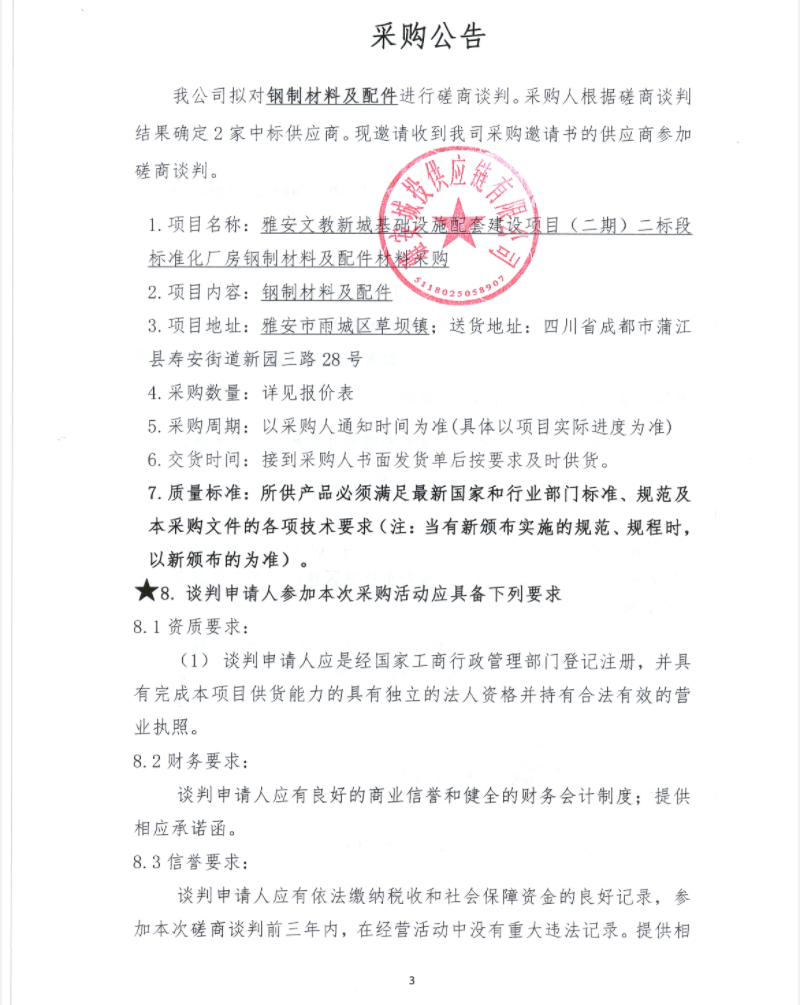 雅安文教新城基礎(chǔ)設(shè)施配套建設(shè)項(xiàng)目(二期)二標(biāo)段標(biāo)準(zhǔn)化廠房鋼制材料及配件材料采購公告