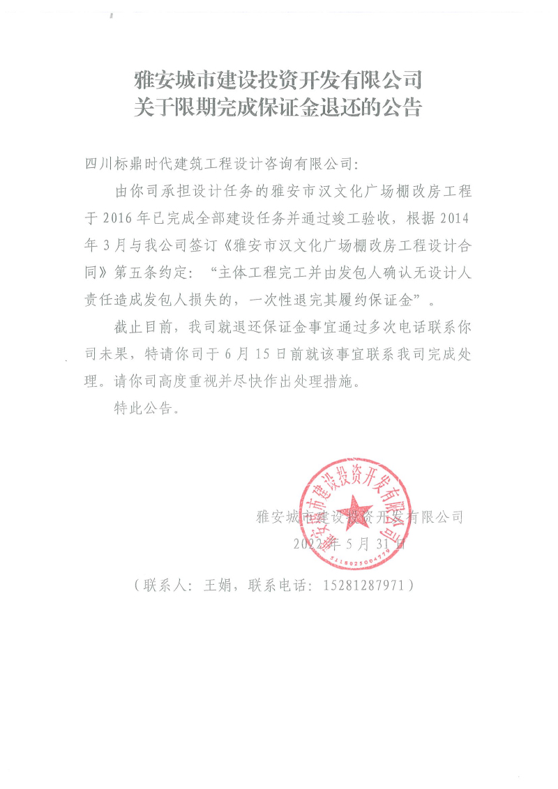 雅安城市建設(shè)投資開(kāi)發(fā)有限公司關(guān)于限期完成保證金退還的公告
