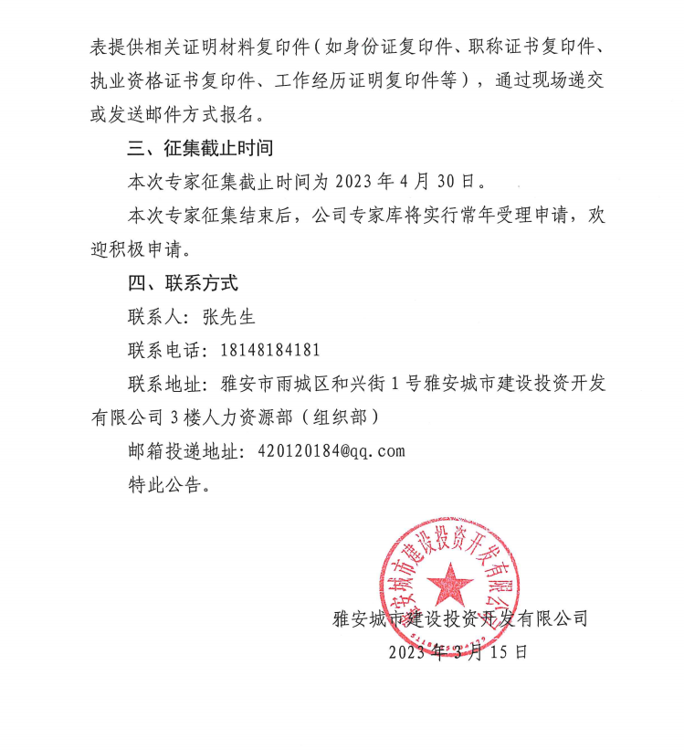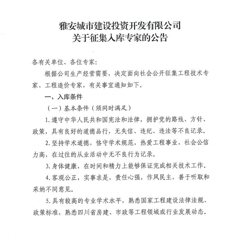 雅安城市建設(shè)投資開發(fā)有限公司關(guān)于征集入庫(kù)專家的公告