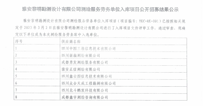 雅安黎明勘測設(shè)計有限公司測繪服務(wù)勞務(wù)單位入庫項(xiàng)目公開招募結(jié)果公示