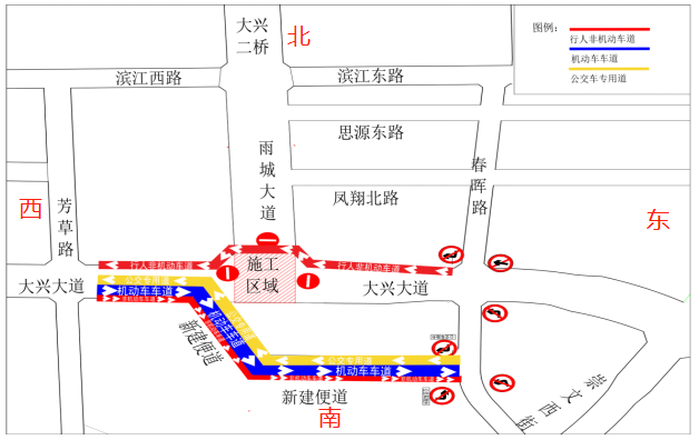 斷道期間封閉段禁止所有機動車通行、非機動車、行人通行(公交車不受影響)。